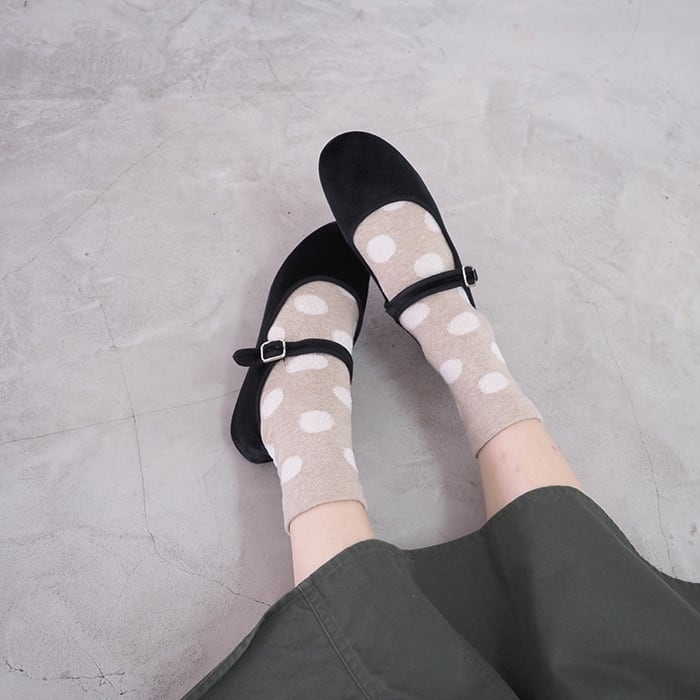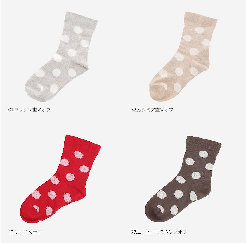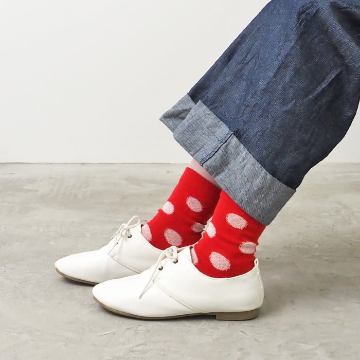 ※このソックスは「カットボス」と呼ばれる方法でドット柄を作っています。その特性上カットした裏糸がだまになることがあります。ご理解の上お買い求めください。お洗濯の際はネットに入れていただき、乾燥機のご利用はご遠慮ください。