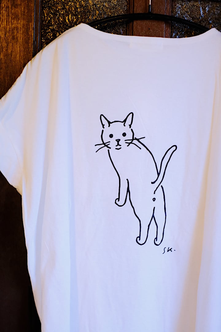 猫を描くフリーイラストレーター・小泉さよさんとのコラボTシャツで、背中には思わず笑顔になるような愛らしいネコのプリント入り。