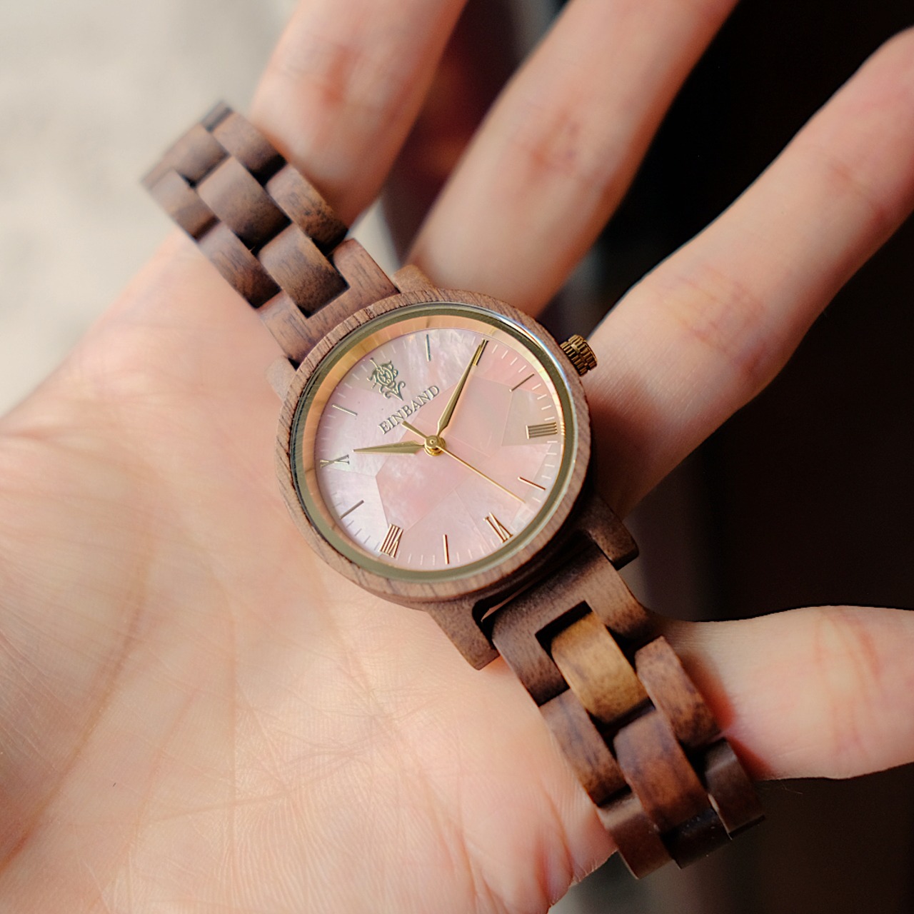 【日本製ウッドウォッチ】EINBAND Reise ピンクマザーオブパール×クルミ 天然貝木製腕時計 32mm