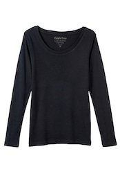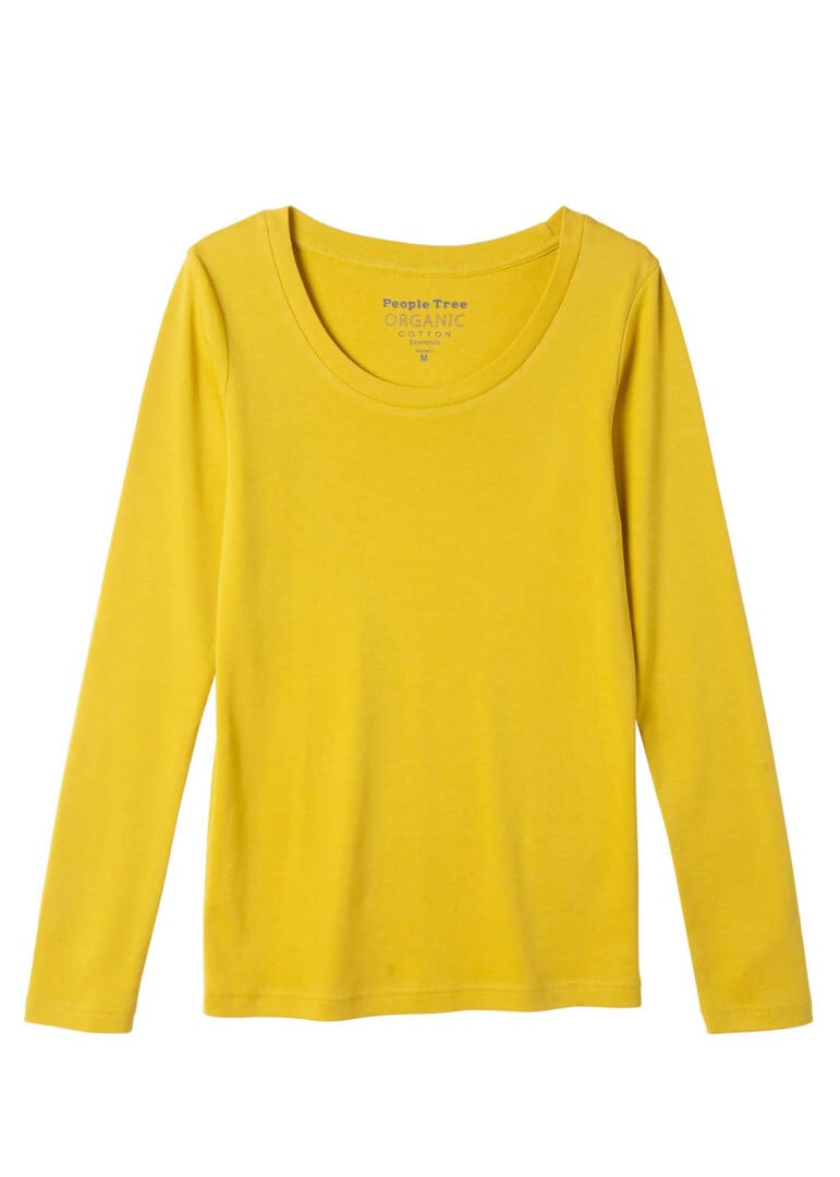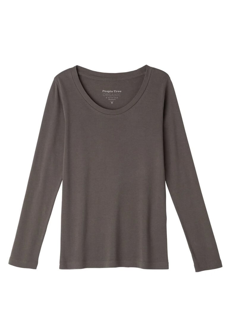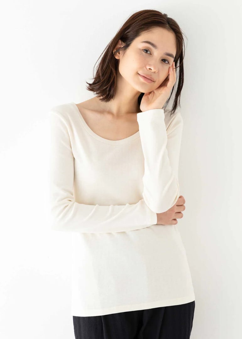 デコルテを美しく見せてくれるスクープネック(襟広め)のトップスです。