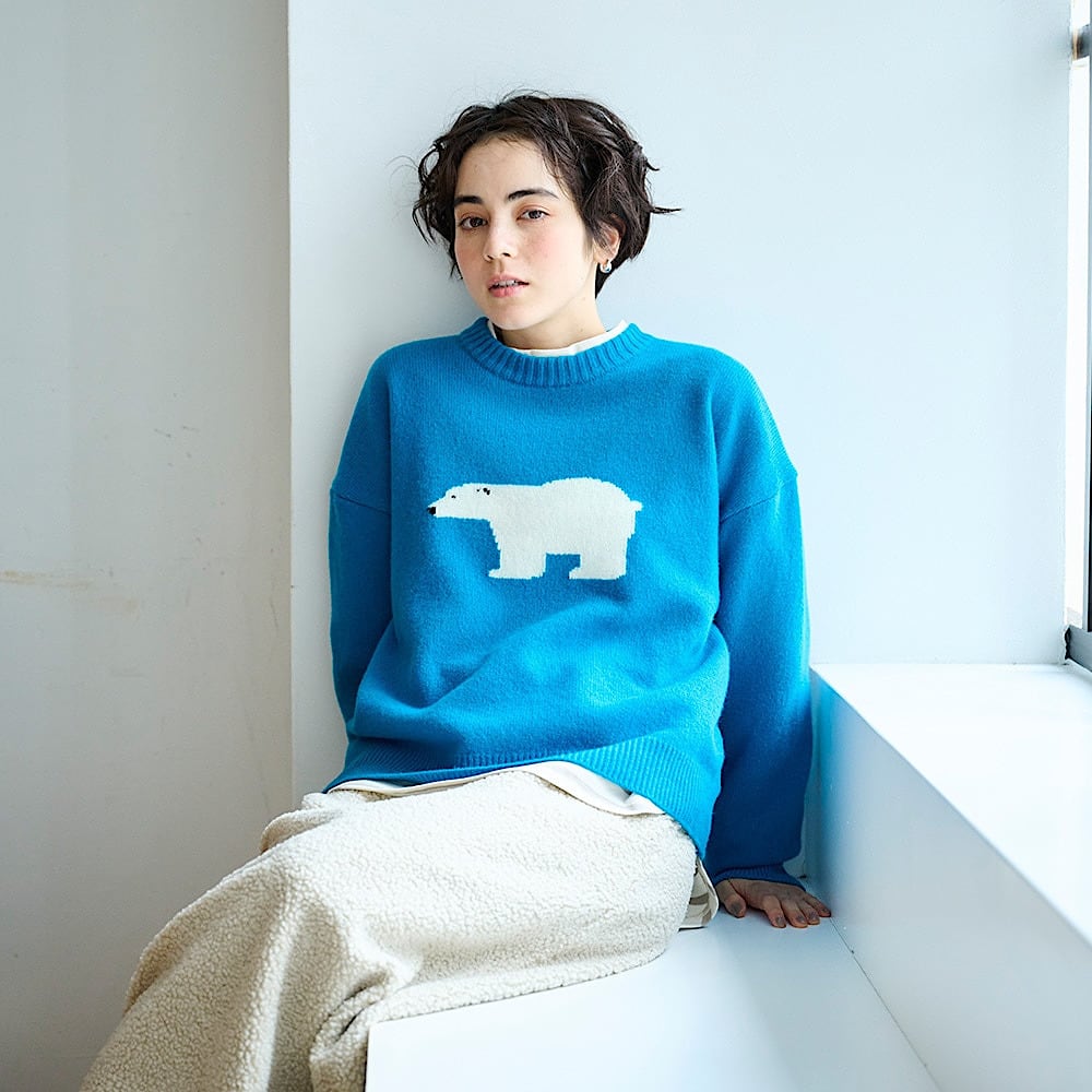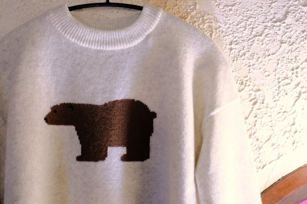 胸元にあしらわれた大きなクマのモチーフが、シンプルなニットにユーモアと愛らしさをプラス。