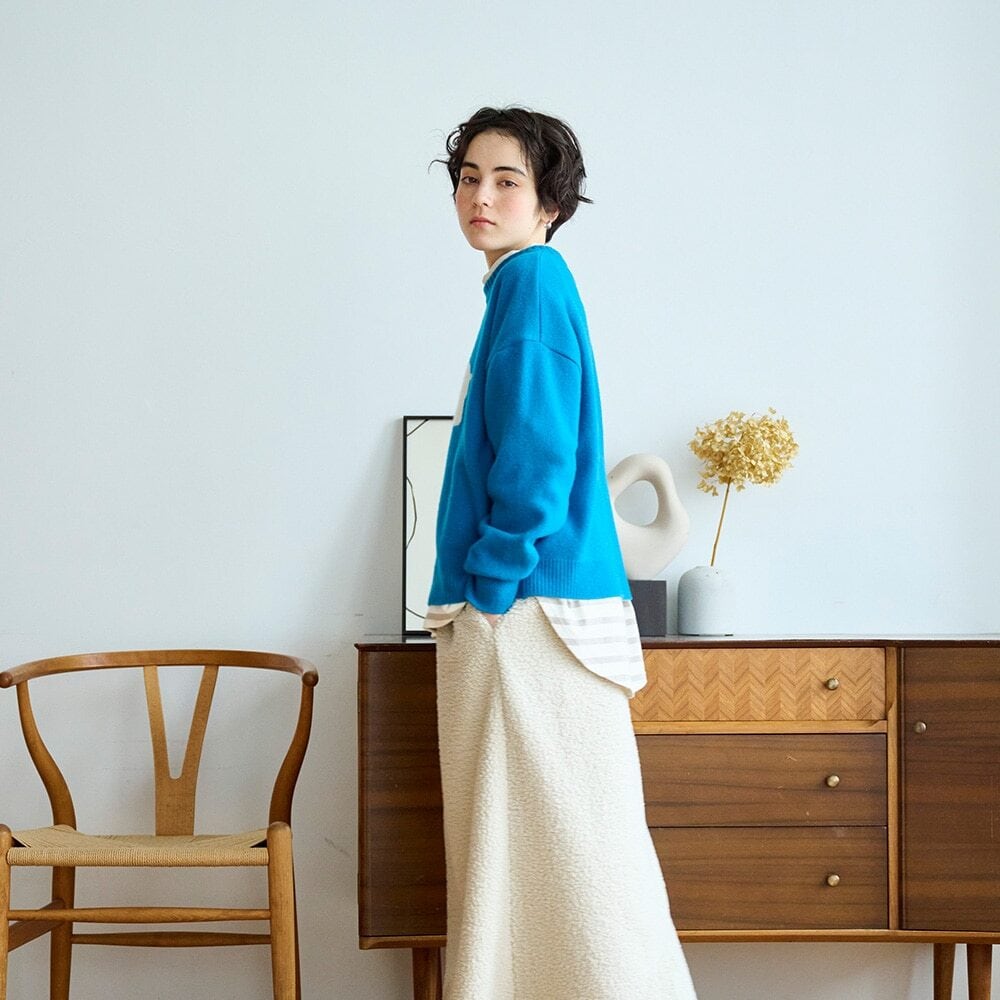 ゆったりとしたドロップショルダーと少し丸みのあるフォルムが、女性らしいやわらかさを演出。