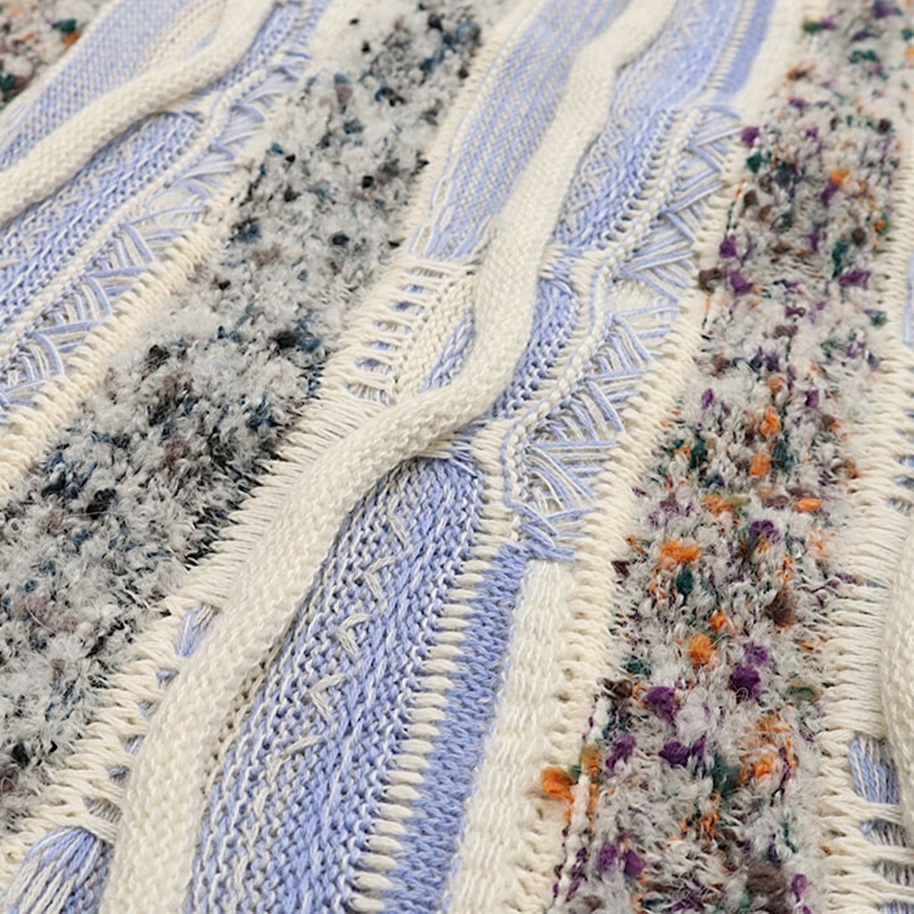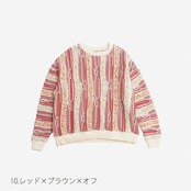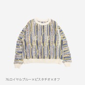 大胆なデザインと立体構造の織りそして、太めのシルエットのクージー柄のマーブルウェーブ クルーネックニットです。