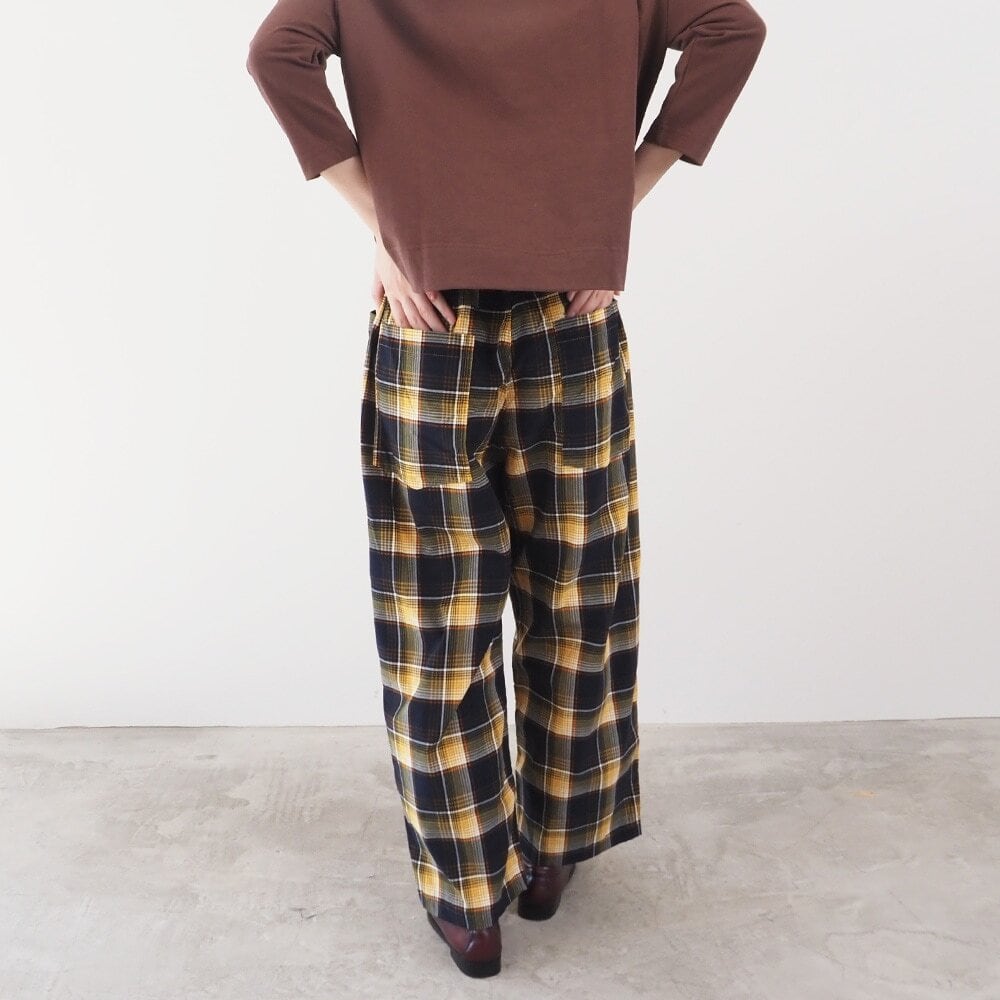 柔らかなシャツコール素材に、温かみのあるチェック柄をのせた季節感たっぷりのパンツ。