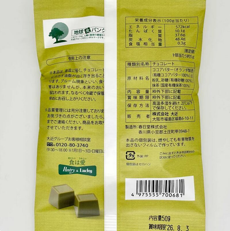 ココアバター(オランダ製造)(有機ココアバター100%)、全粉乳、砂糖(有機砂糖100%)、抹茶(国産有機抹茶100%)