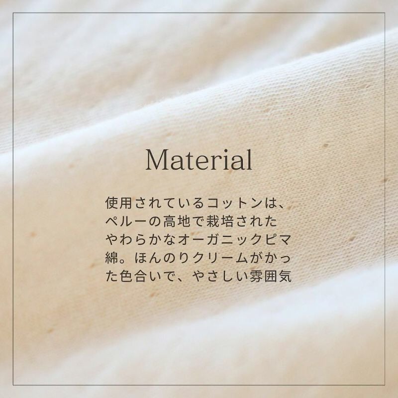最高品質のペルー産のピマコットンを使用し、オイリーで滑らかな肌ざわりと、深みのある光沢を生かした、やさしい風合いに仕上がっています。