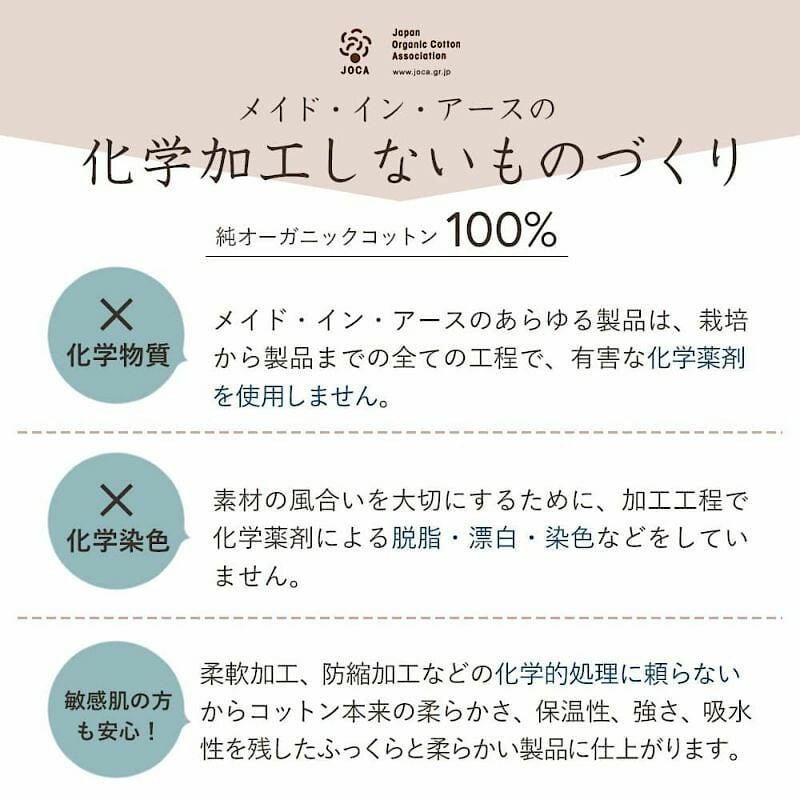 ・防縮加工などの化学的な処理をせず、自然なままの状態で仕上げているので、お洗濯後は多少縮むことがあります。そのぶん製品はあらかじめ大きくつくっています。