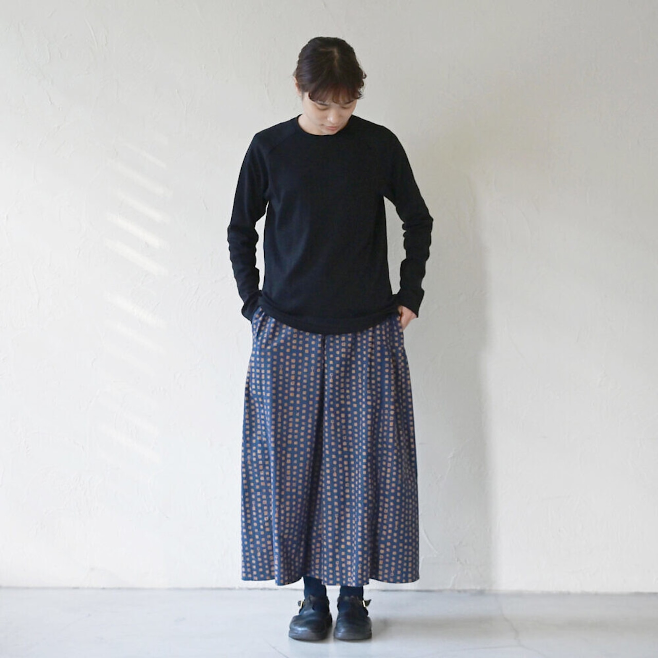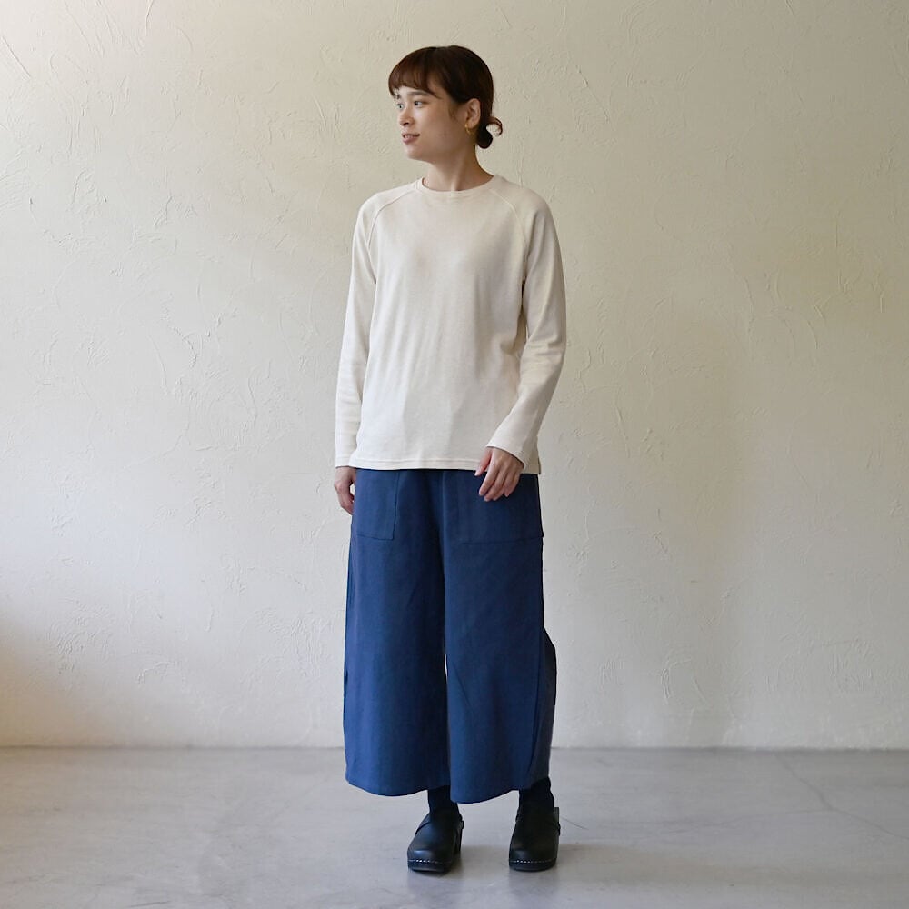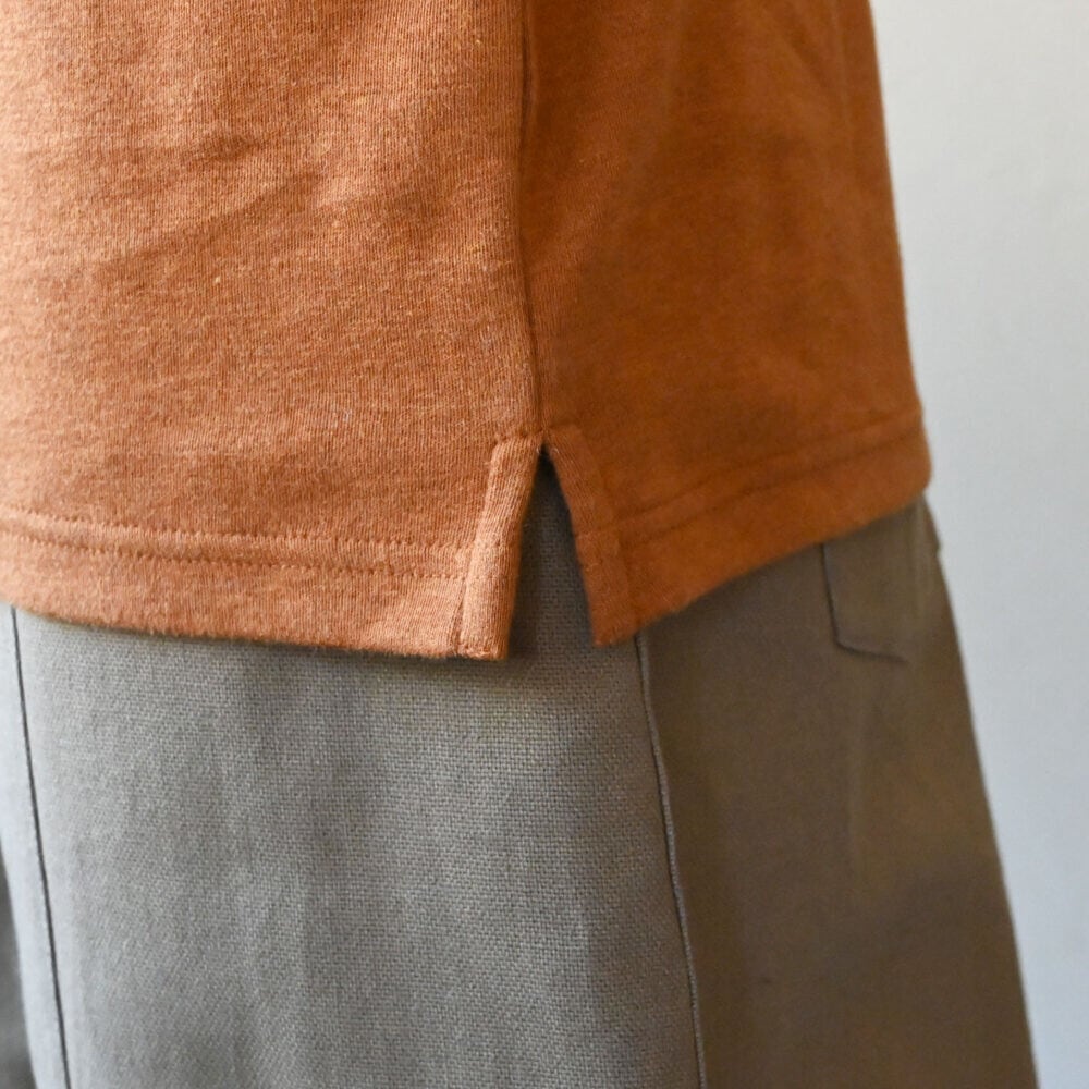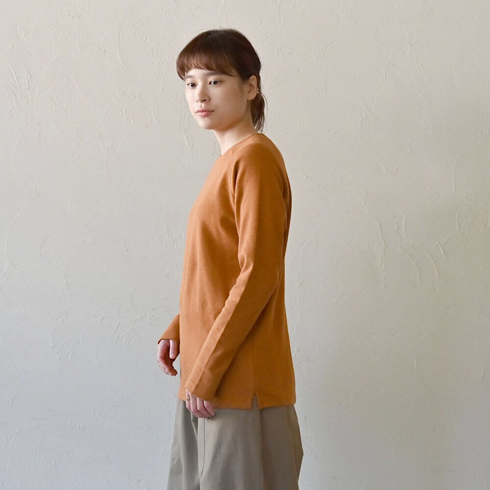 裾がやや長めでスリットが入り、秋冬はインナーとして、春夏は1枚で着ても。