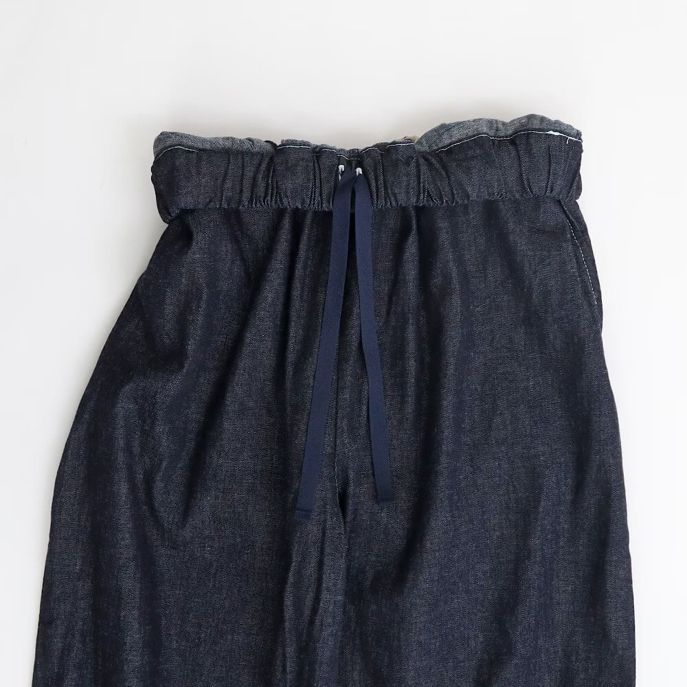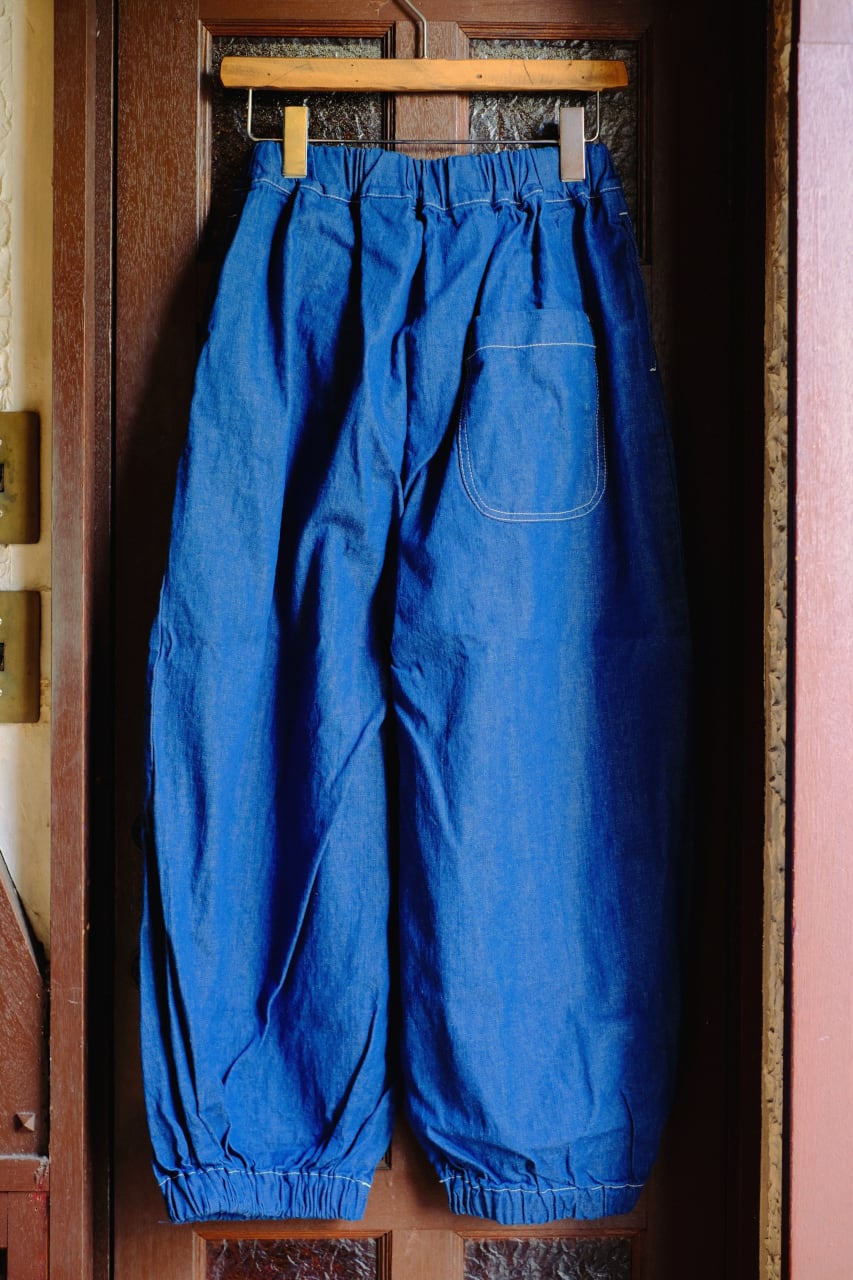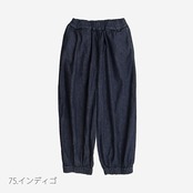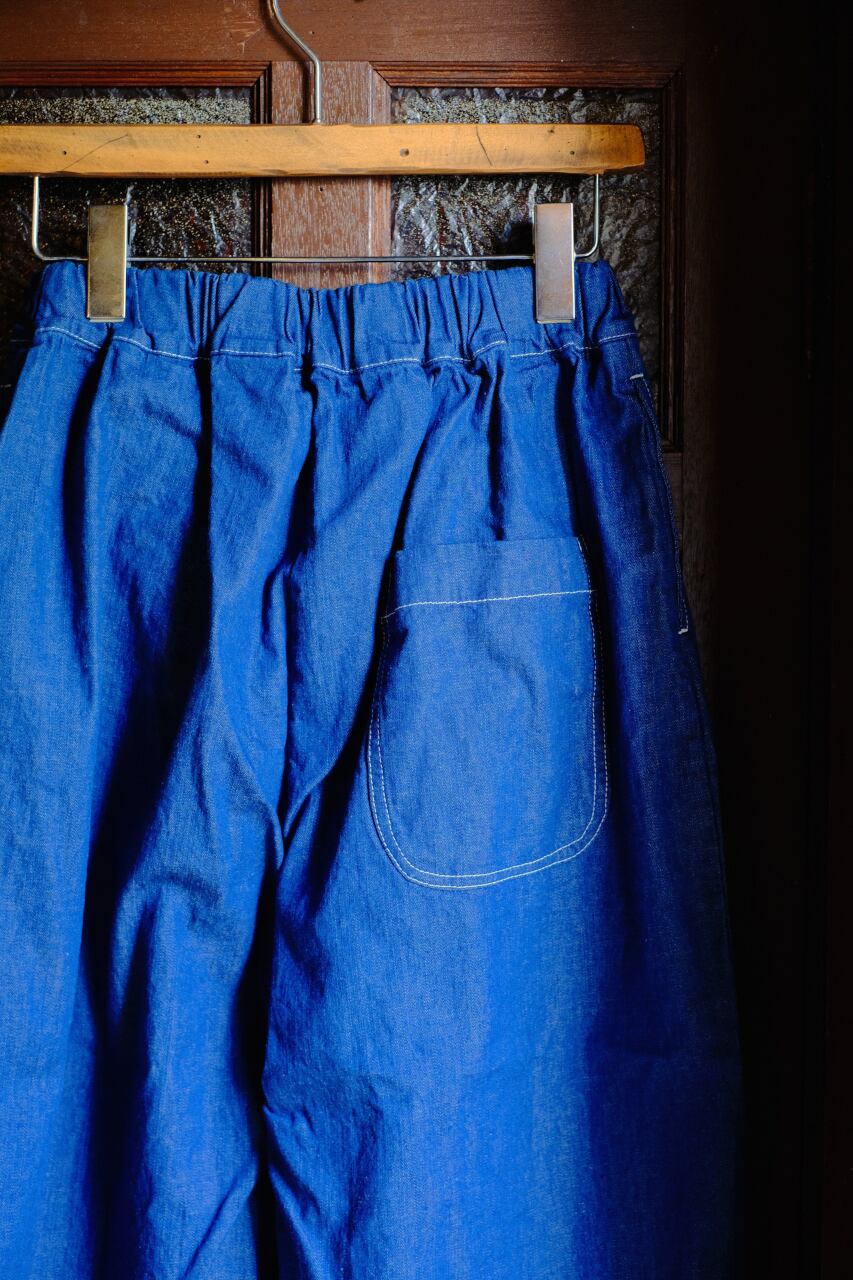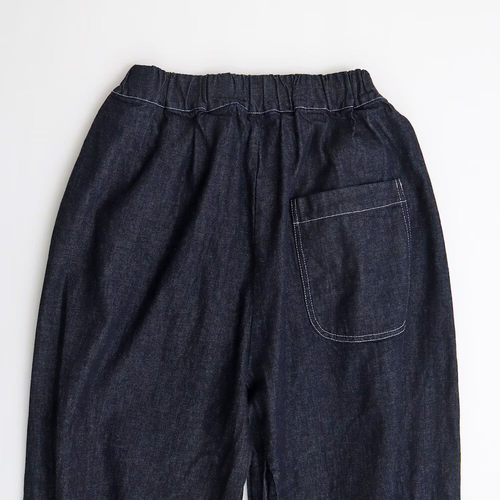 やわらかな8オンス(ライトオンス)の薄手ムラデニムで仕立てた、とても軽くて丸みのあるシルエットのポップパンツです。