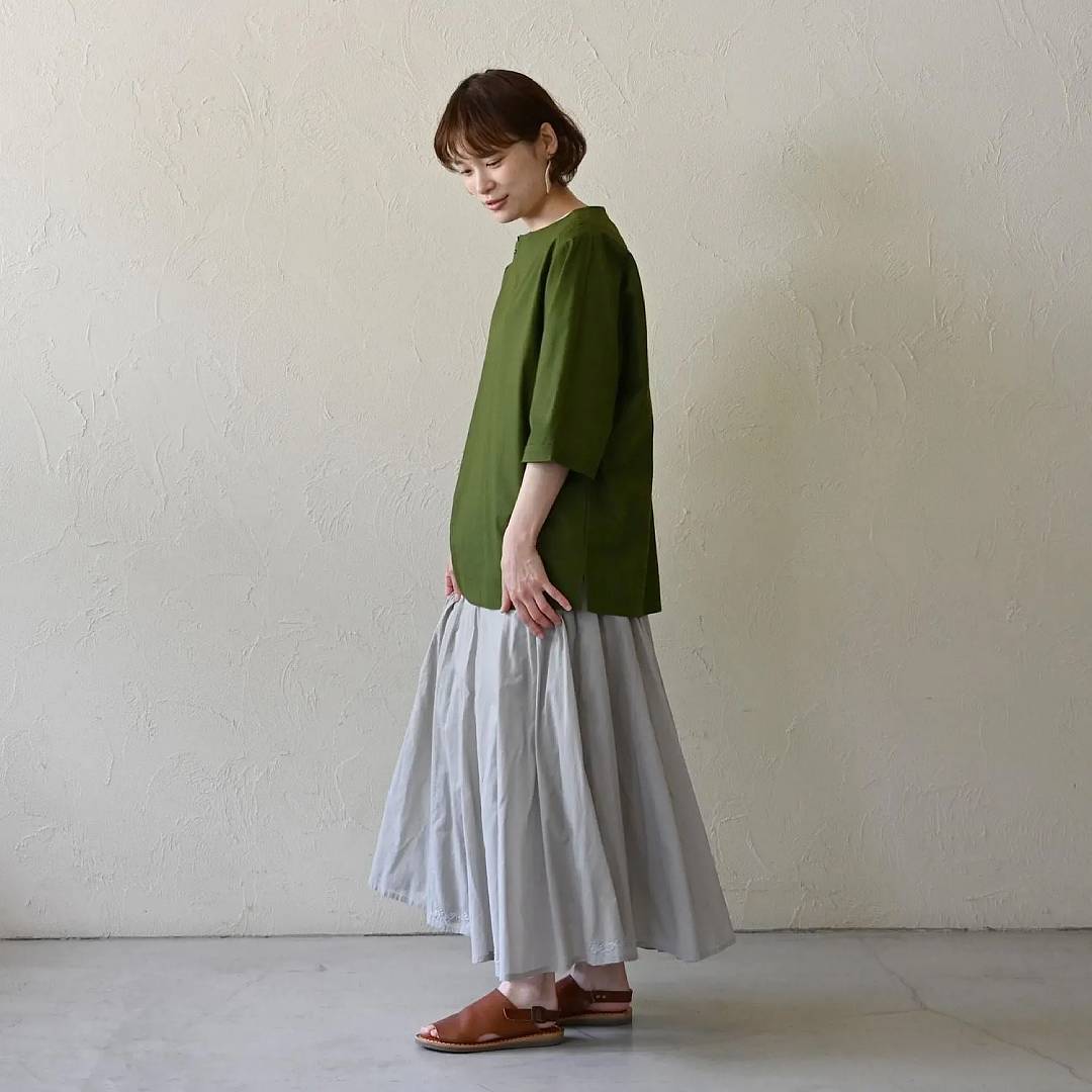 襟元や裾などにステッチを施し、シンプルなシルエットにアクセントを。