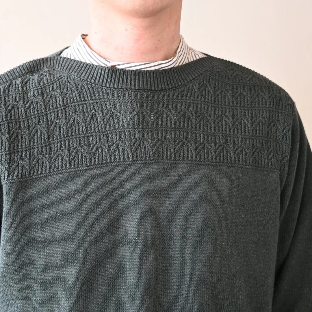 細やかな透かし編みが襟元を彩るニットトップスの登場。