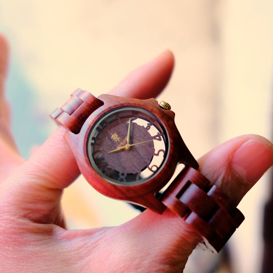 裏蓋がガラスになっていますので金属アレルギーにも優しい木製腕時計となります。
